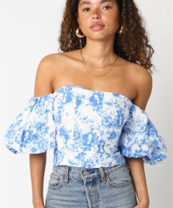 Pippa & Pearl Women’s Apparel Tiffany Floral Print Off The Shoulder Puff Sleeve Top – Blue | Blue