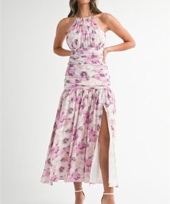 Pippa & Pearl Women’s Dresses Summer Floral Print Ruched Halter Midi Dress – Yellow | Yellow