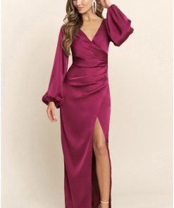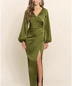 Pippa & Pearl Women’s Dresses Sloane Long Sleeve Satin Maxi Dress – Olive Green | Olive Green
