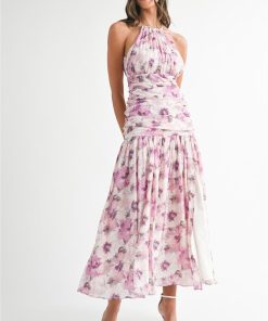 Pippa & Pearl Women’s Dresses Summer Floral Print Ruched Halter Midi Dress – Yellow | Yellow