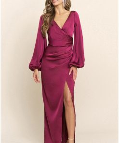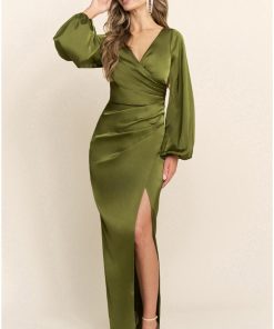 Pippa & Pearl Women’s Dresses Sloane Long Sleeve Satin Maxi Dress – Olive Green | Olive Green