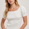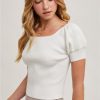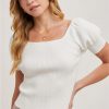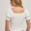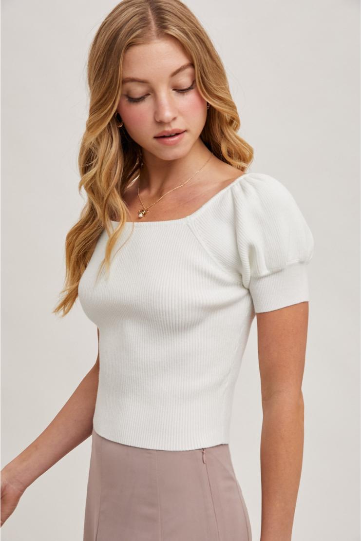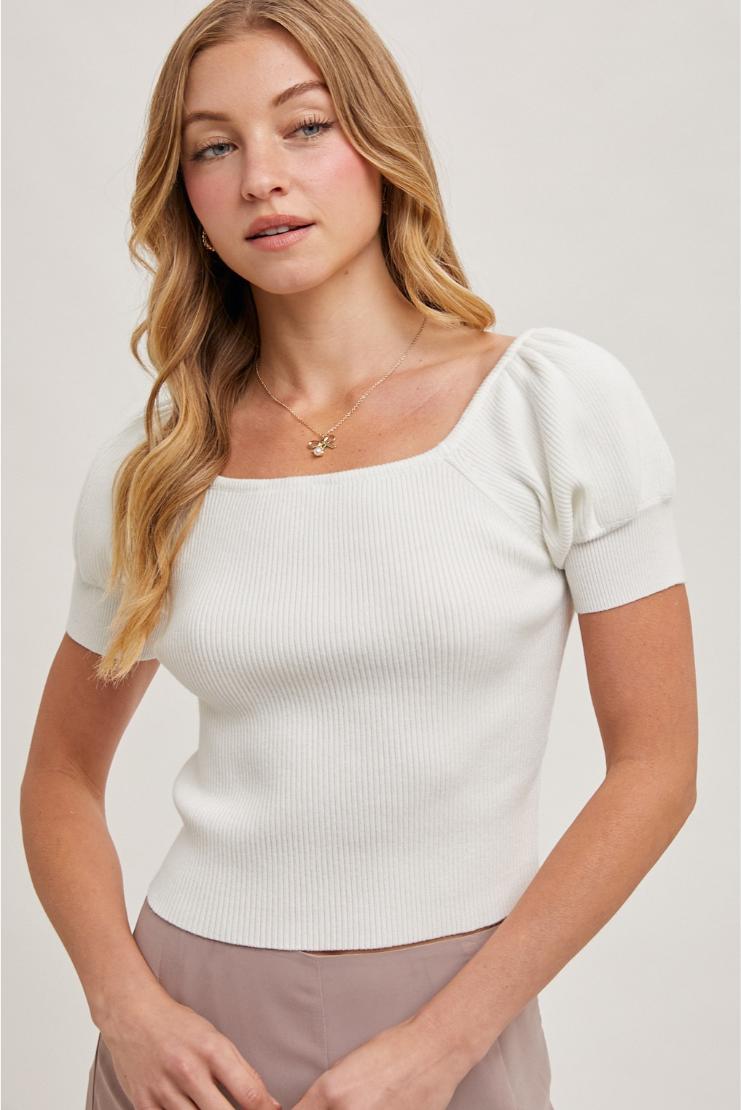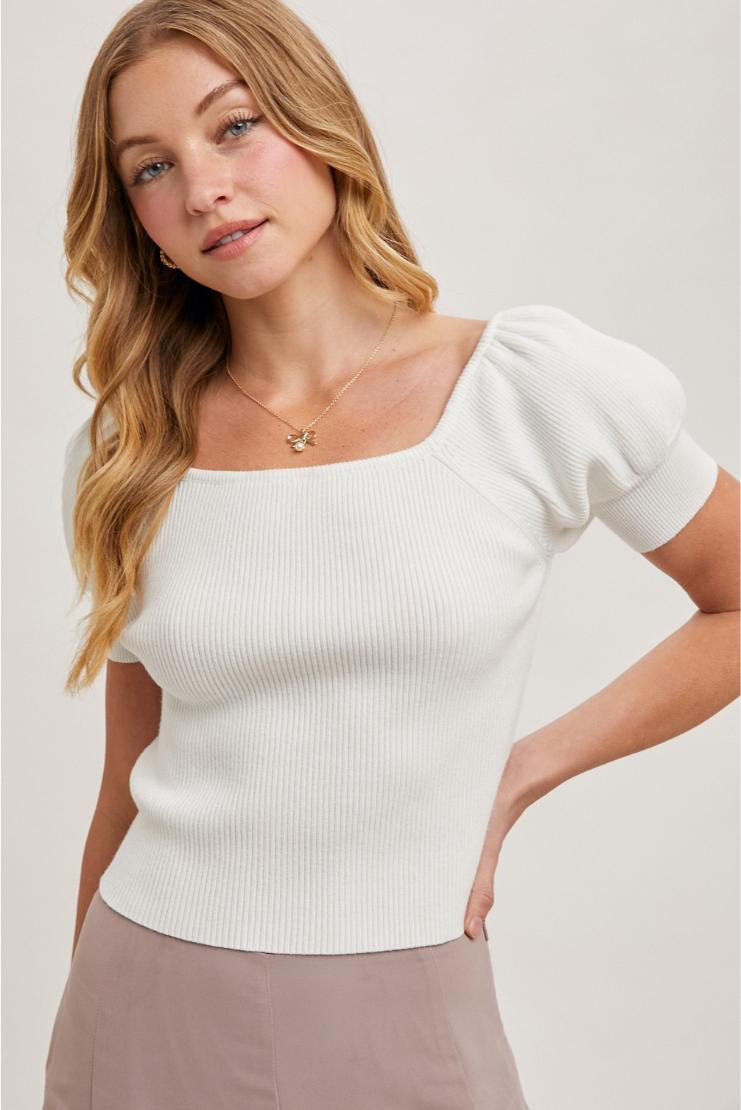 Revamp your wardrobe with the Amy Square Neck Puff Short Sleeves Knit Top. Vintage charm meets modern comfort with this stylish top. Perfect for a casual day out or a night on the town.