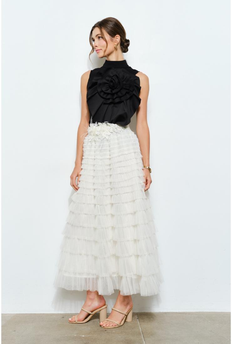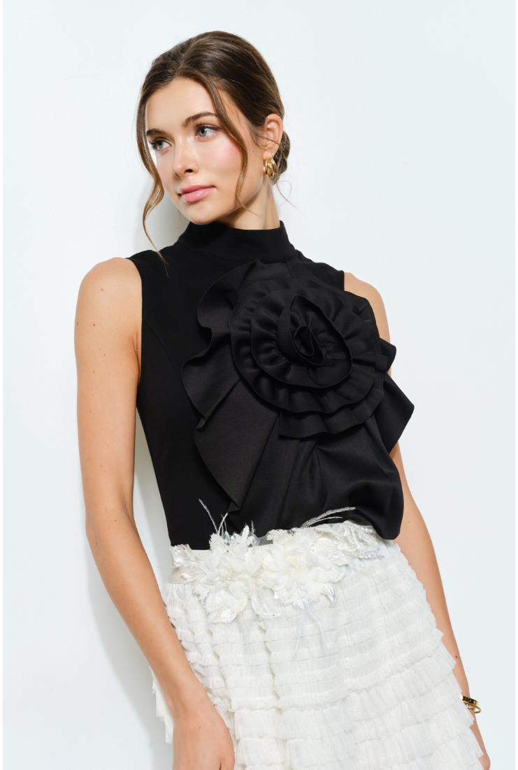 Elevate your style with the Ava 3D Floral Pleated High Neck Top in crisp black. This playful piece features delicate 3D floral details and elegant pleats that add texture and charm. The high neck design brings a touch of sophistication, making it perfect for both casual outings and dressier occasions. Light, airy, and effortlessly chic, this top is sure to brighten your wardrobe and turn heads wherever you go.