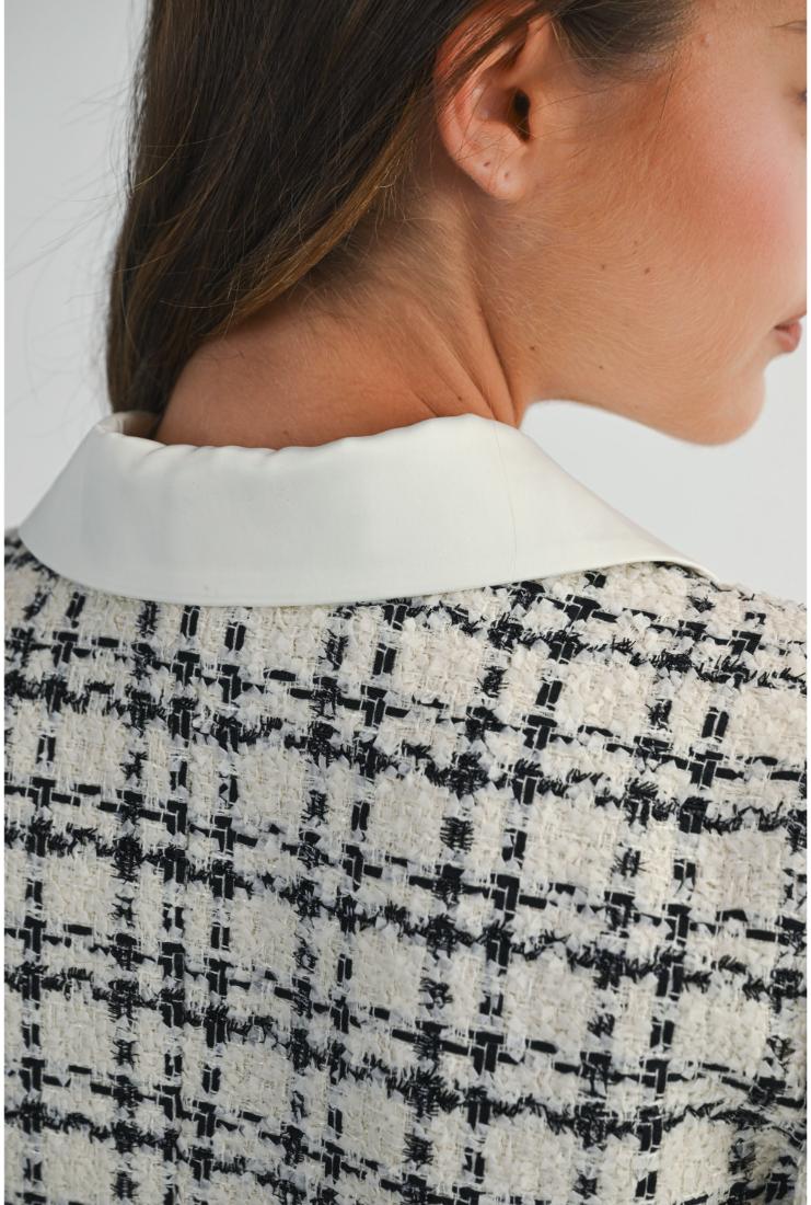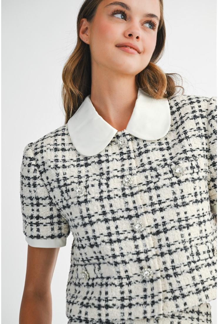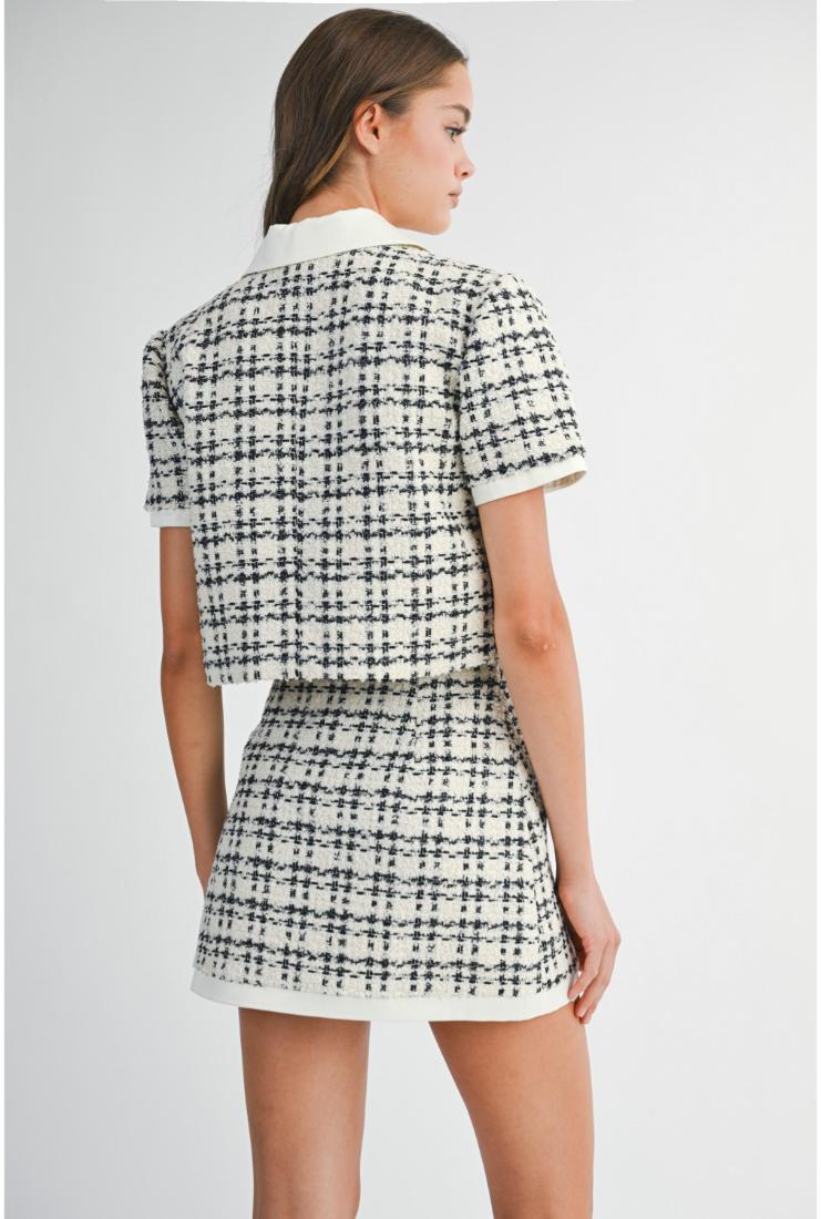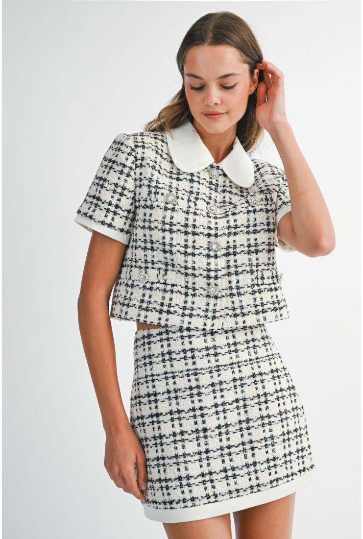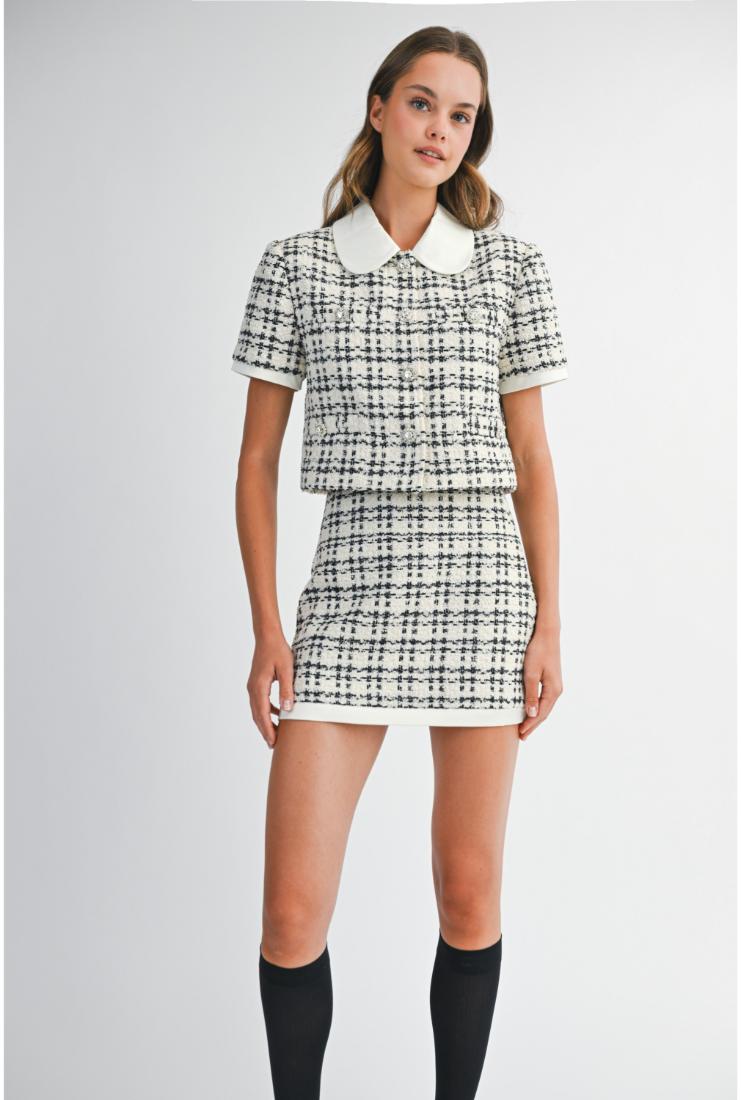 Step out in style with the Blaire Plaid Tweed Cropped Jacket and Mini Skirt, each sold separately for mix-and-match fun. This playful duo brings classic plaid tweed charm with a modern cropped twist, perfect for turning heads whether you wear them together or apart. Add a dash of chic to your wardrobe and create endless outfit possibilities!