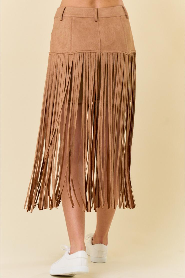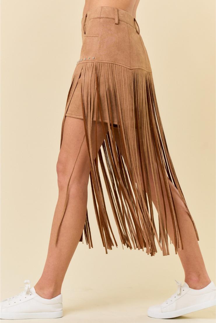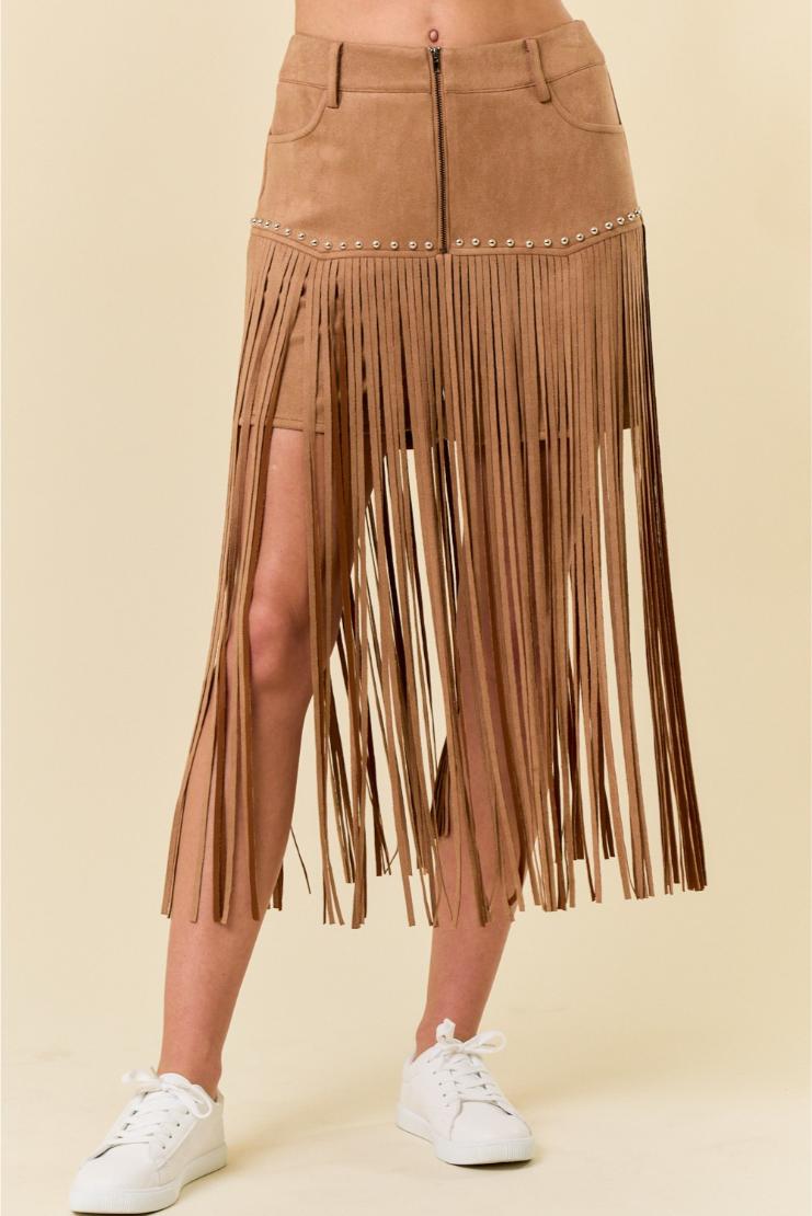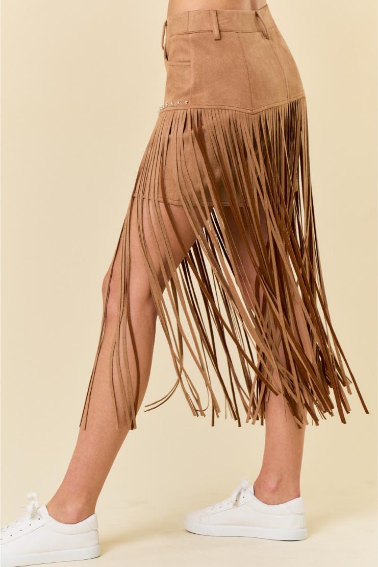 Get ready to turn heads in our playful and stylish Bonnie Faux Suede Fringe Midi Skirt! Made with soft faux suede, this skirt features trendy fringe detailing that adds a touch of fun to any outfit. Whether you’re hitting the town or dressing up for a night out, this skirt/shorts has got you covered. So go ahead, get your fringe on!