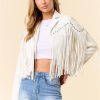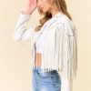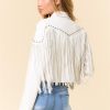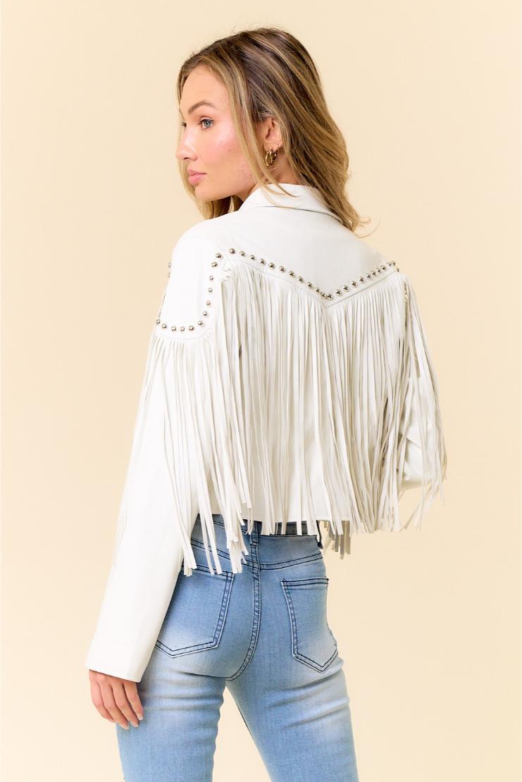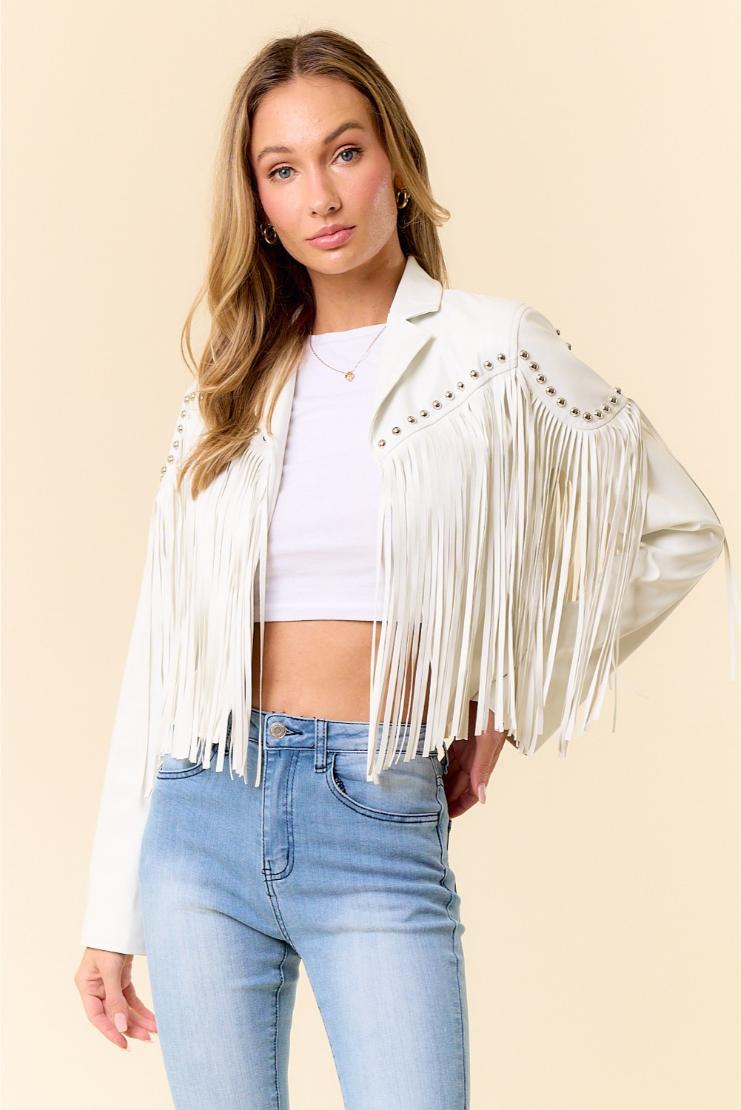 Unleash your inner rockstar in the Callie Fringe Faux Leather Stud Detail Jacket. With fringe details and edgy stud accents, this jacket is perfect for making a statement. Amp up any outfit with this versatile piece.