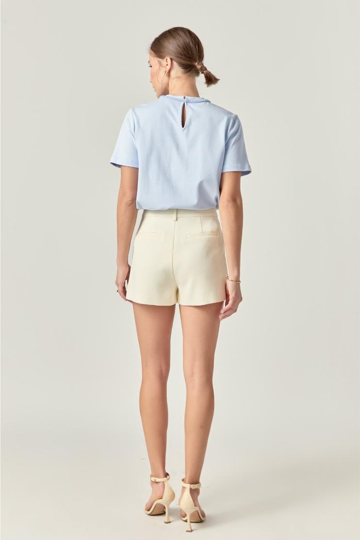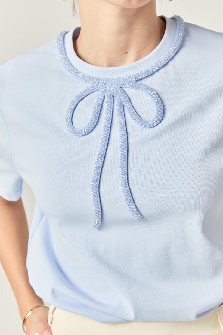 Elevate your everyday style with our Elsie top in dreamy light blue! This short sleeve charmer features a whimsical beaded bow at the neckline that adds just the right amount of sparkle to your day. Perfect for pairing with your favorite jeans or tucking into a skirt for brunch with the girls