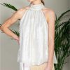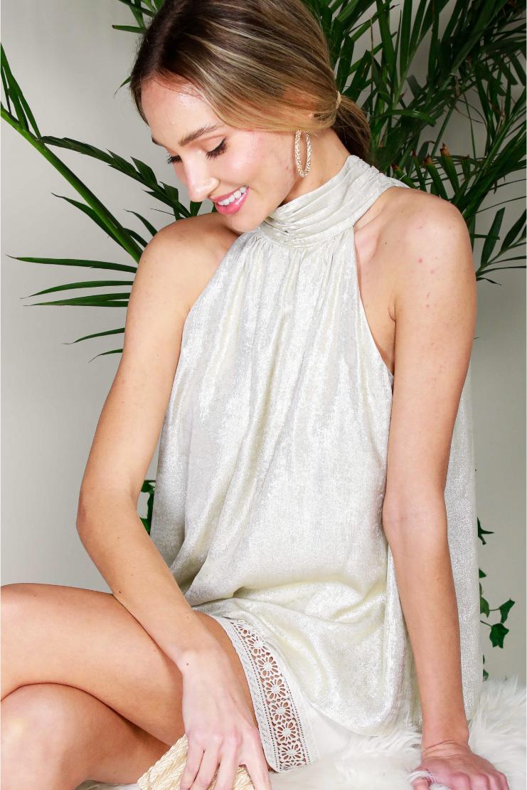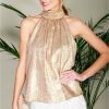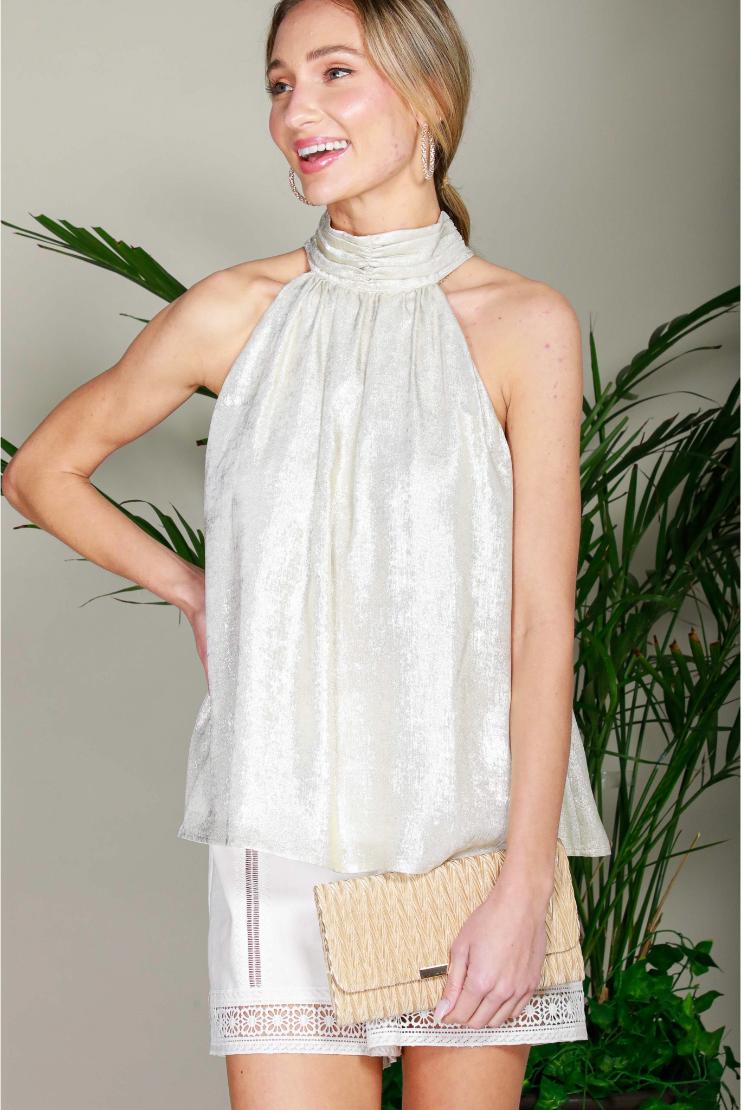 This shimmering halter top is perfect for a night out on the town. With metallic accents and a sleeveless design, you’ll be sure to stand out and turn heads. Get ready to shine in the Goldie Halter Metallic Sleeveless Top.