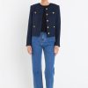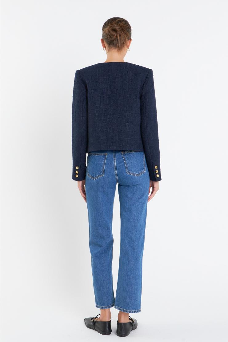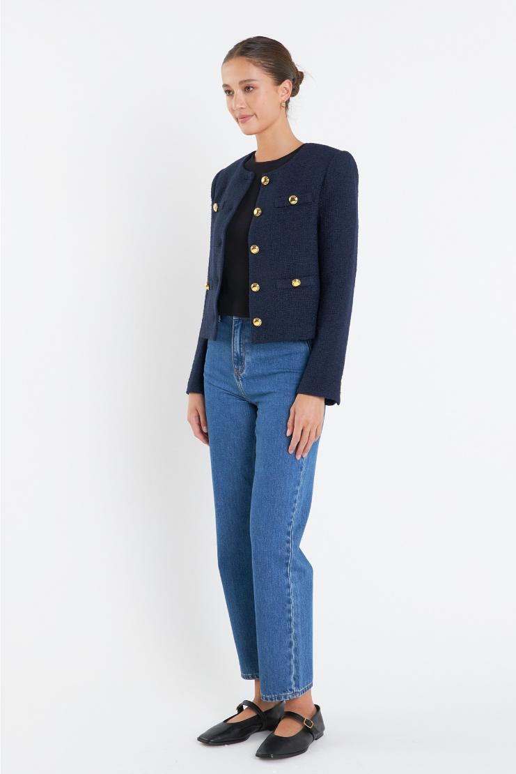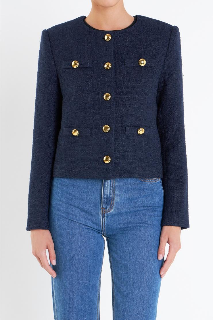 Score some serious style points with our Navy Blue Gold Button Tweed Jacket! This jacket features a classic yet trendy tweed design with shiny gold buttons for a touch of glamour. Perfect for adding a touch of sophistication to any outfit.