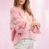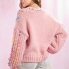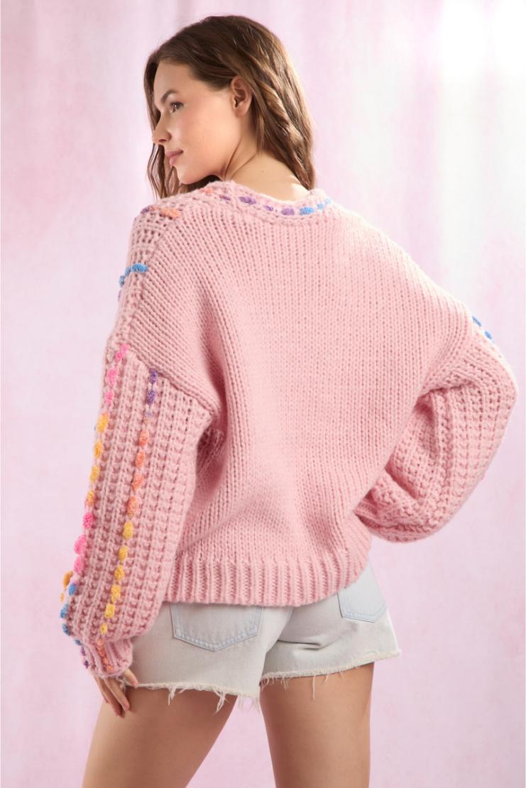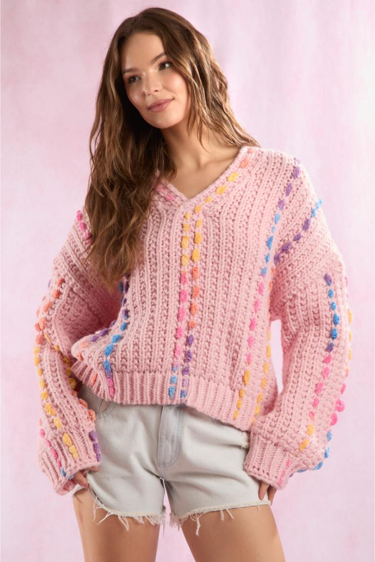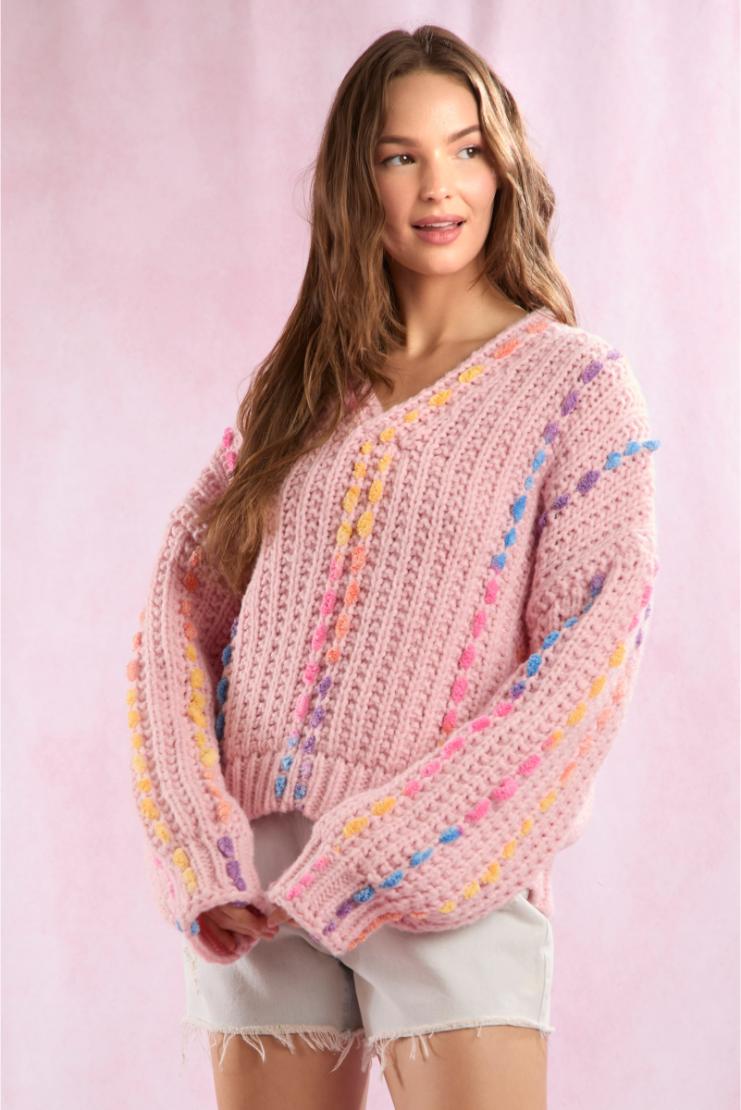 Get ready to stand out with our Layan Rainbow Stitching Detail V-Neck Sweater in pink. This one-of-a-kind sweater features vibrant stitching and a flattering V-neck design. Perfect for adding a pop of color to your wardrobe and keeping you warm in style.