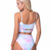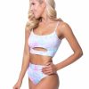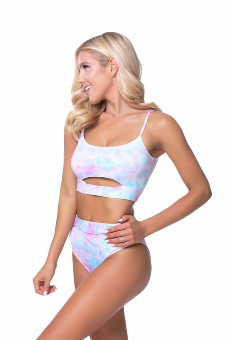 Front cut-out bodice top and sweet tie dye hues add to the considerable charm of a two-piece swimsuit.