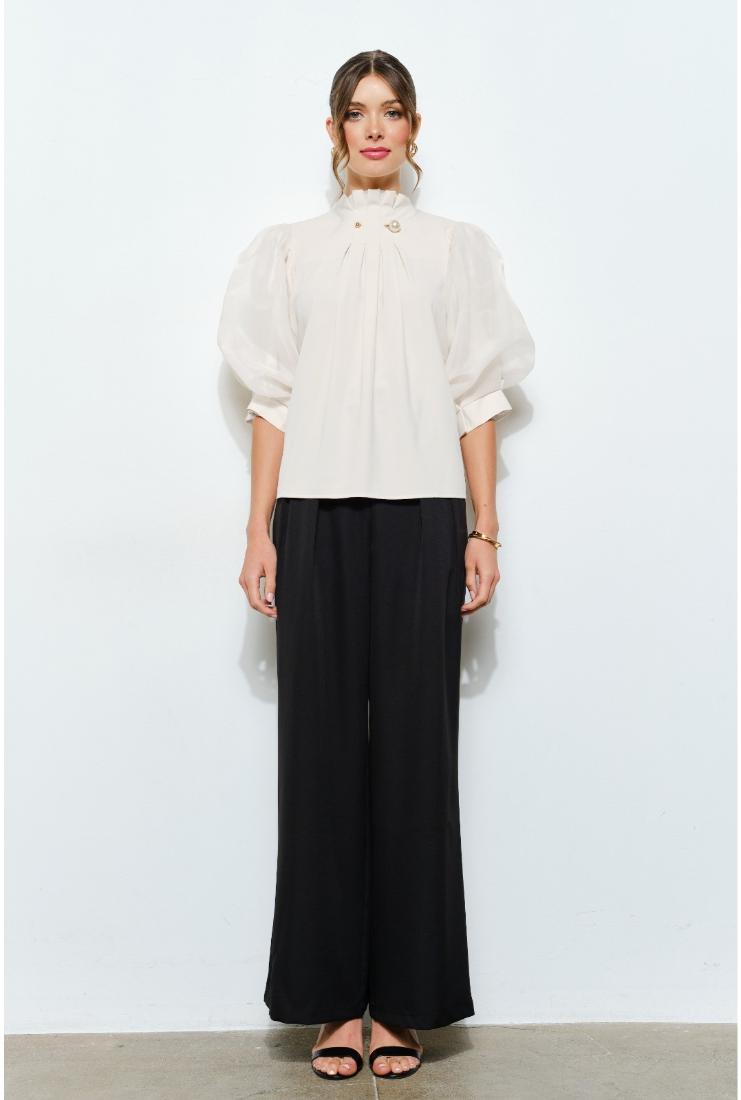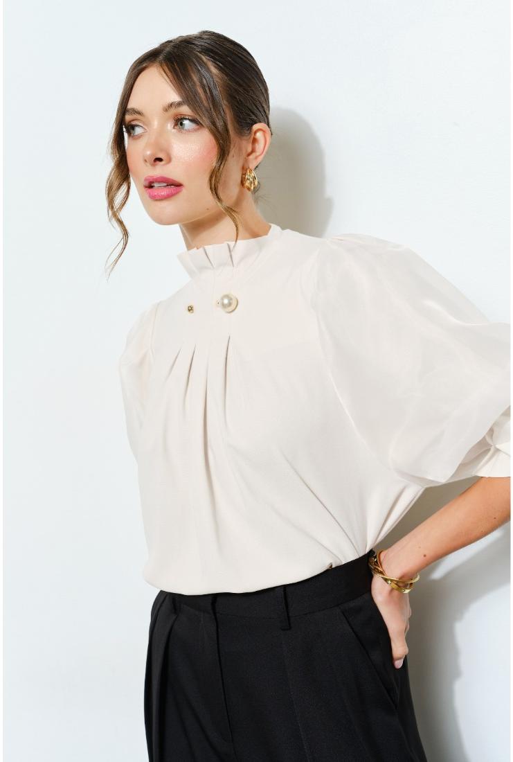 Elevate your everyday look with the Perla Pearl Detail Pleated Puff Sleeve Blouse. Featuring charming puff sleeves and delicate pearl accents, this blouse adds a whimsical touch to any outfit. The pleated design brings elegance while keeping things light and airy—perfect for feeling effortlessly fabulous all day long.