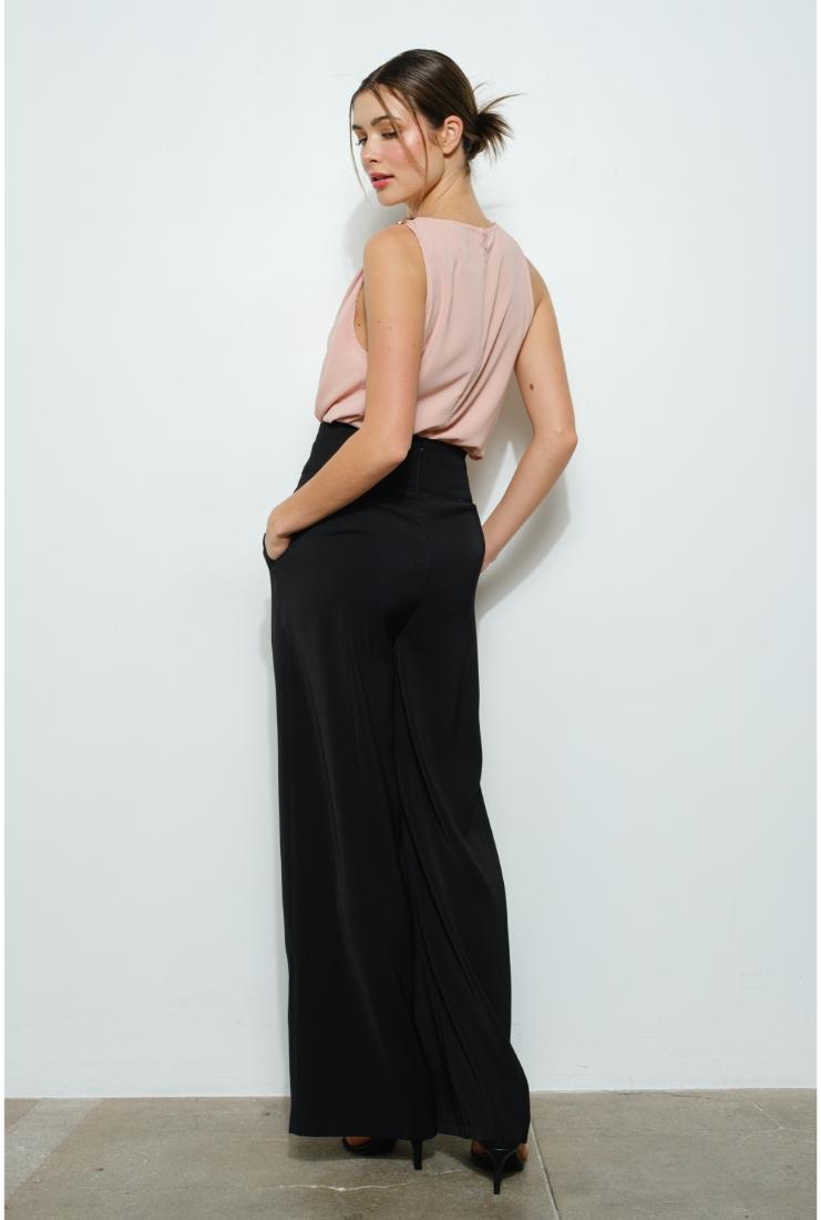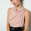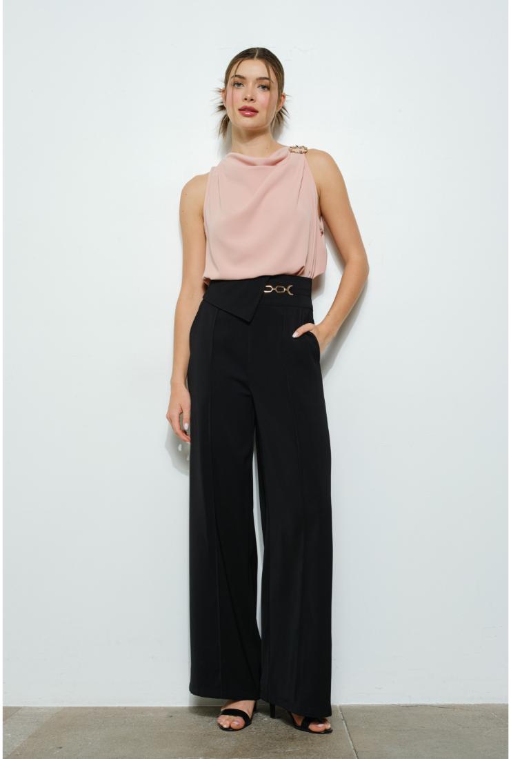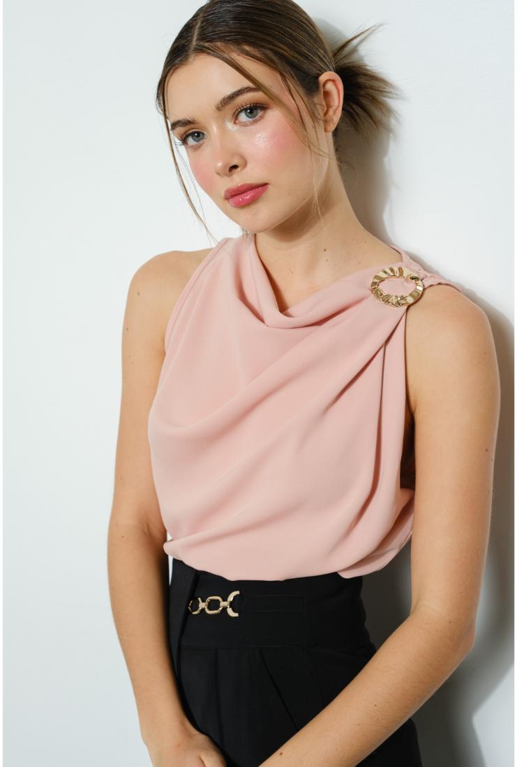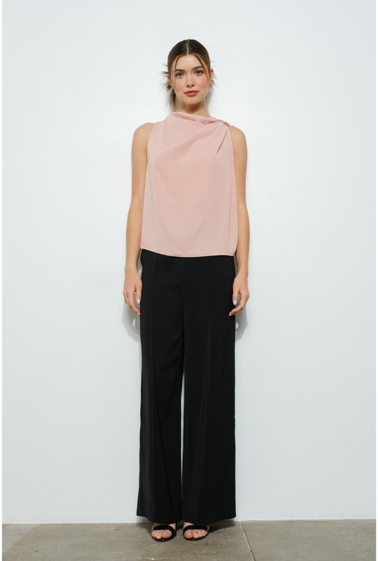 Turn heads with the Ciara Sleeveless Cowl Neck top, featuring a chic gold ring accent that adds a touch of sparkle to your look. Its sleek black fabric drapes effortlessly, making it perfect for day-to-night adventures. Playful yet sophisticated, this top pairs beautifully with your favorite jeans or a flirty skirt for instant style points.