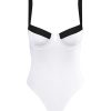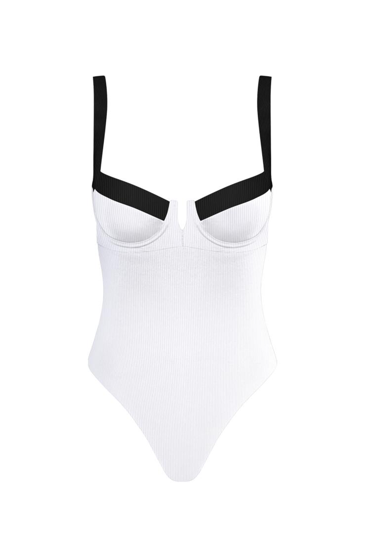 Dive into style with this playful one piece swimsuit – a perfect blend of white and black contrast that will have heads turning (and maybe even a double take). High-cut design creates an elongated silhouette, while providing flattering coverage. Swim with confidence and a bit of sass – you deserve it!