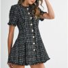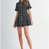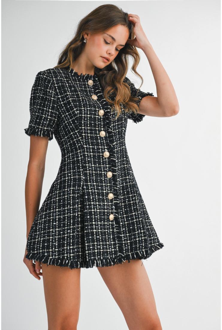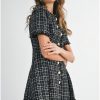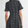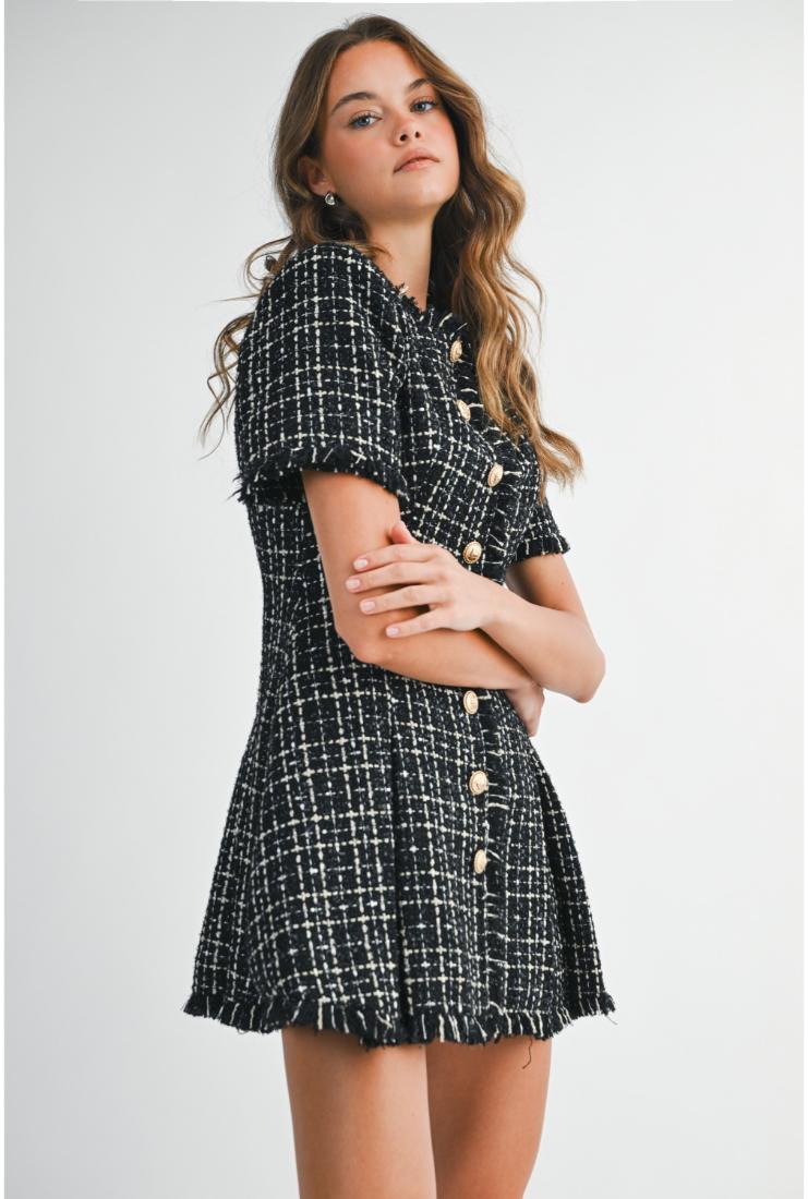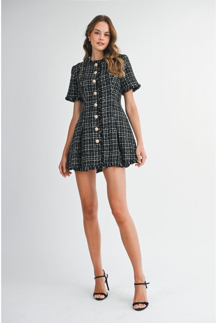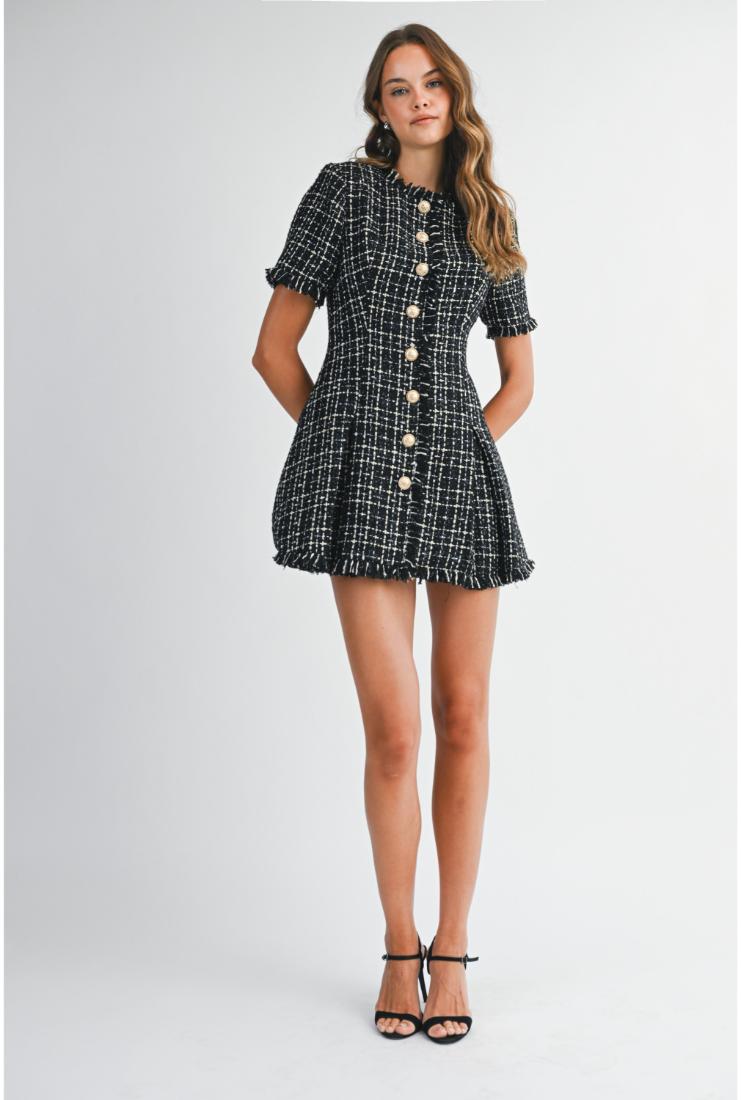 Step out in style with the Arya Tweed Short Sleeve Fit & Flare Mini Dress. This playful dress features a flattering fit-and-flare silhouette that twirls with every move. Crafted from classic tweed, it adds a touch of texture and charm to your look. Perfect for brunch dates or weekend adventures, this mini dress combines comfort and chic effortlessly.