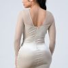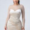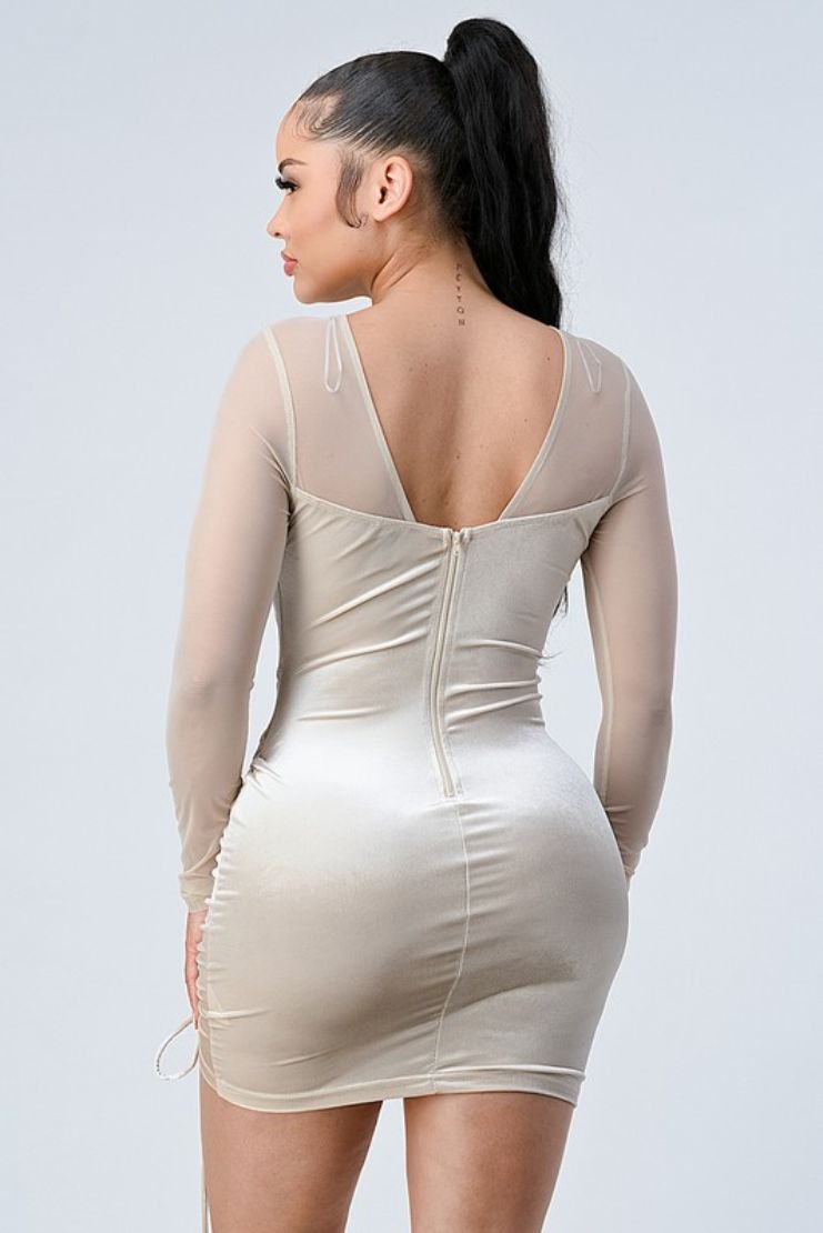 Double takes become second nature when you step out in this sheer long sleeve-velvet mini with side ruching that gathers the knit fabric and all of the attention.
