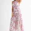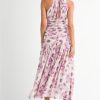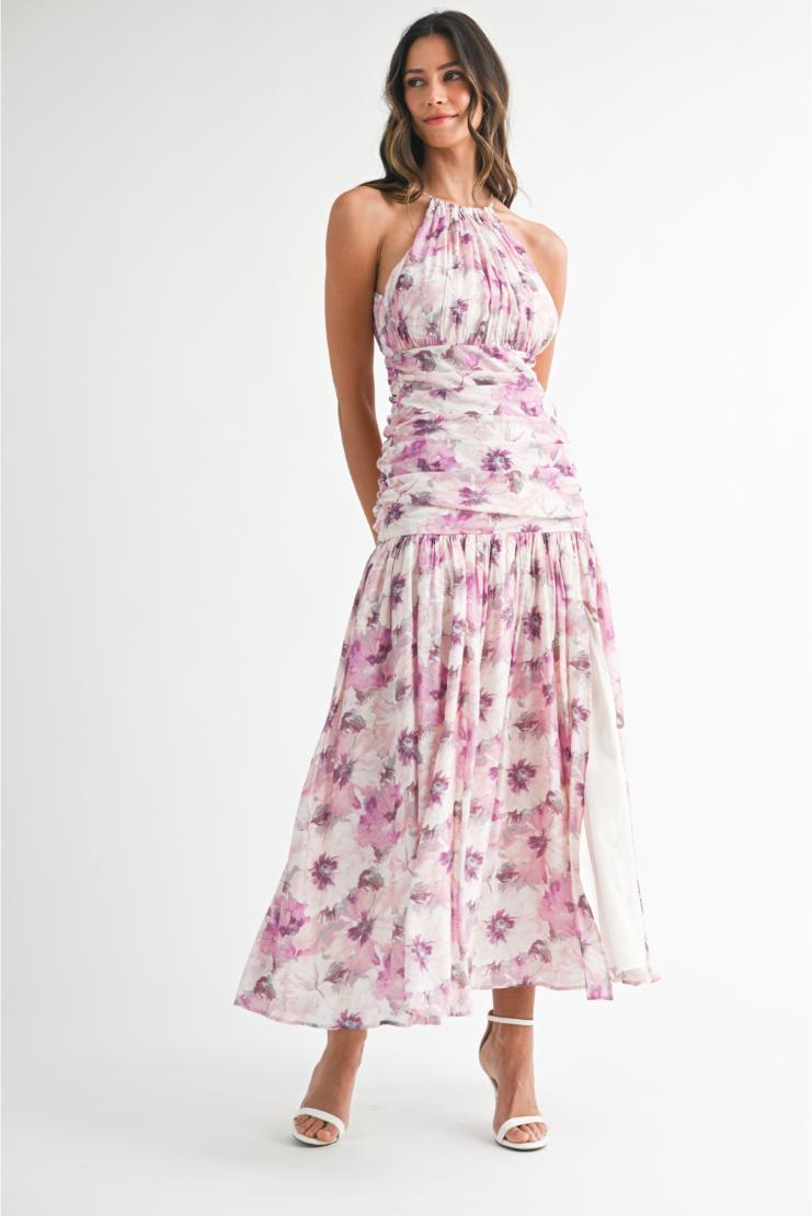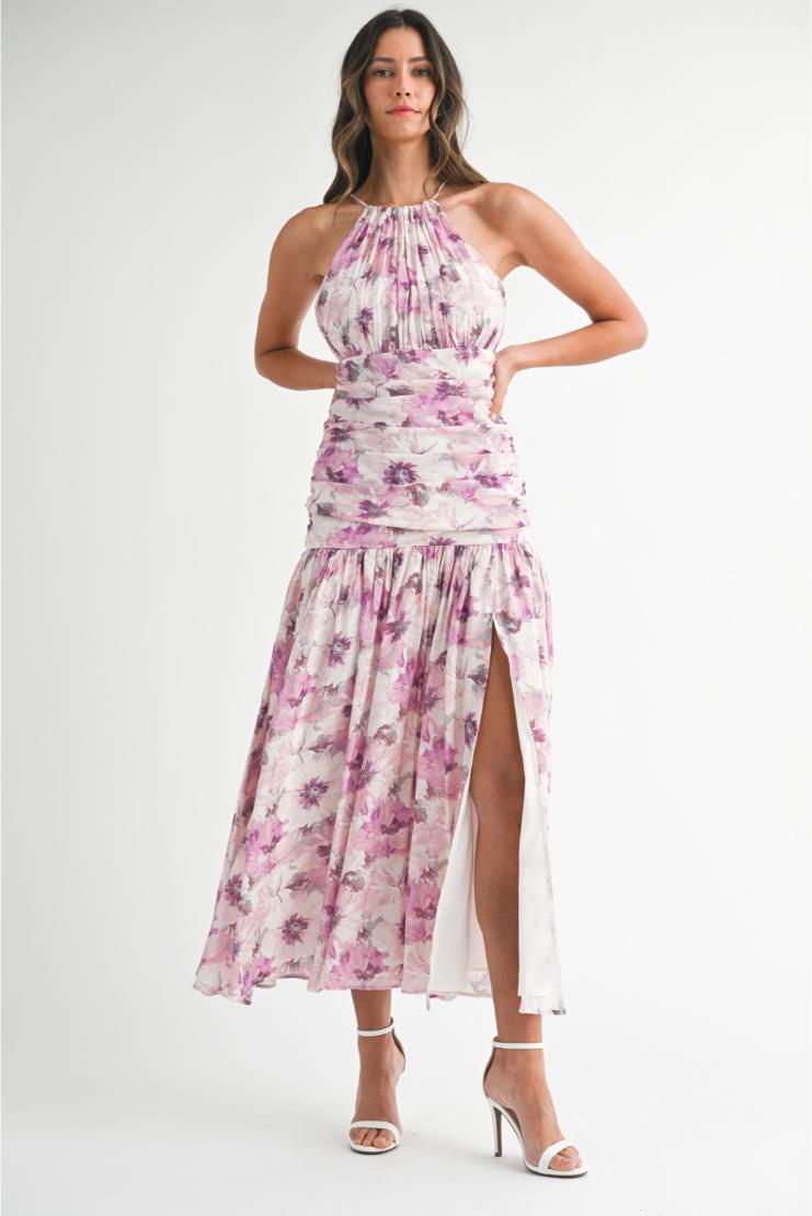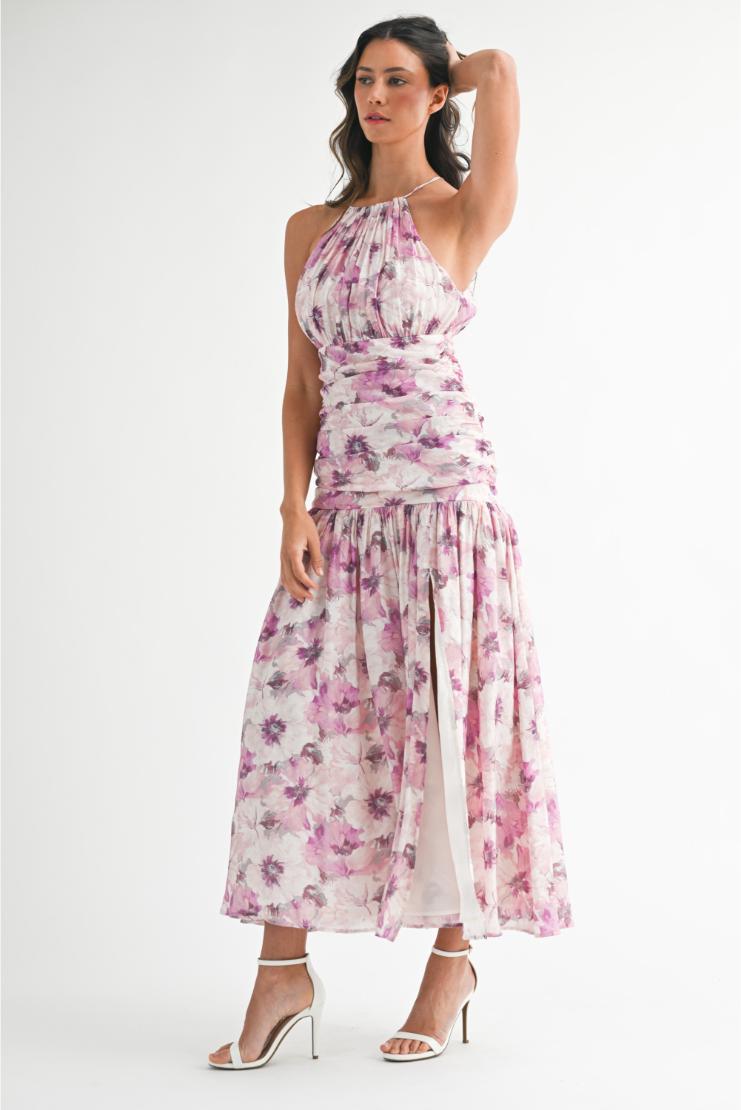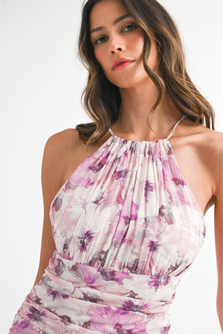 Indulge in the opulence of summer with our Summer Floral Print Ruched Halter Midi Dress in vibrant pink. The intricate floral print and ruched detailing exude sophistication and elegance, while the halter neckline adds a touch of sensuality. Step into the season of style with this exclusive dress.