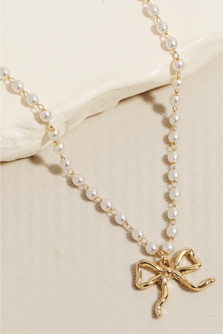Add a touch of whimsy and elegance to your outfit with this Gold Bow and Pearl Chain Necklace. Featuring a delicate gold bow and a string of lustrous pearls, this necklace is perfect for any special occasion or for adding a touch of fun to your everyday look.