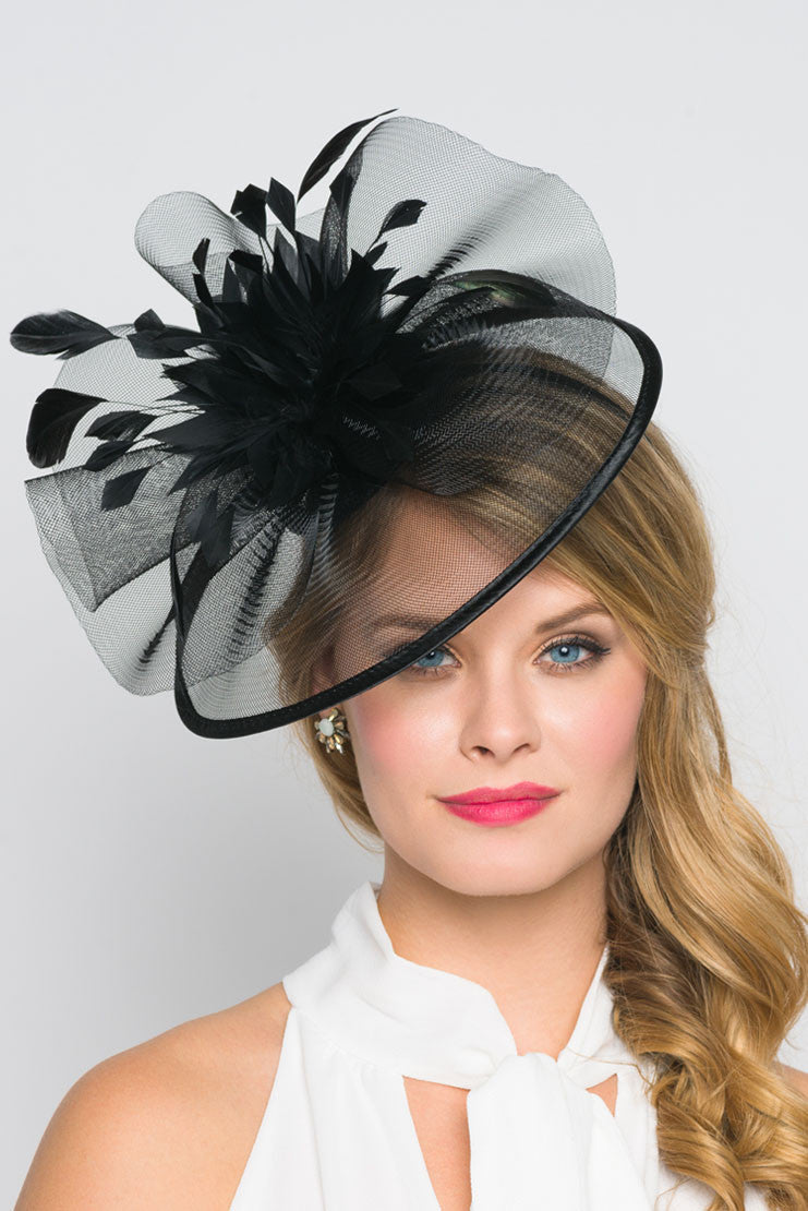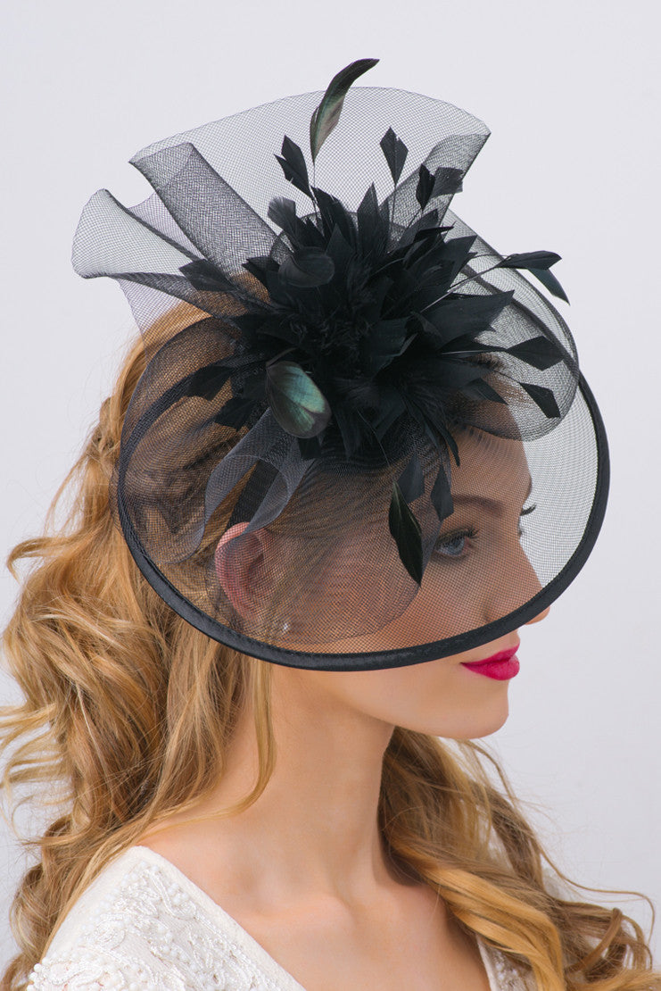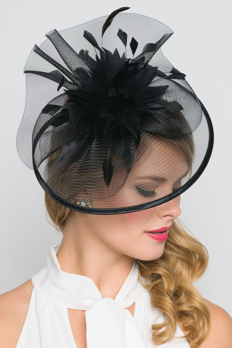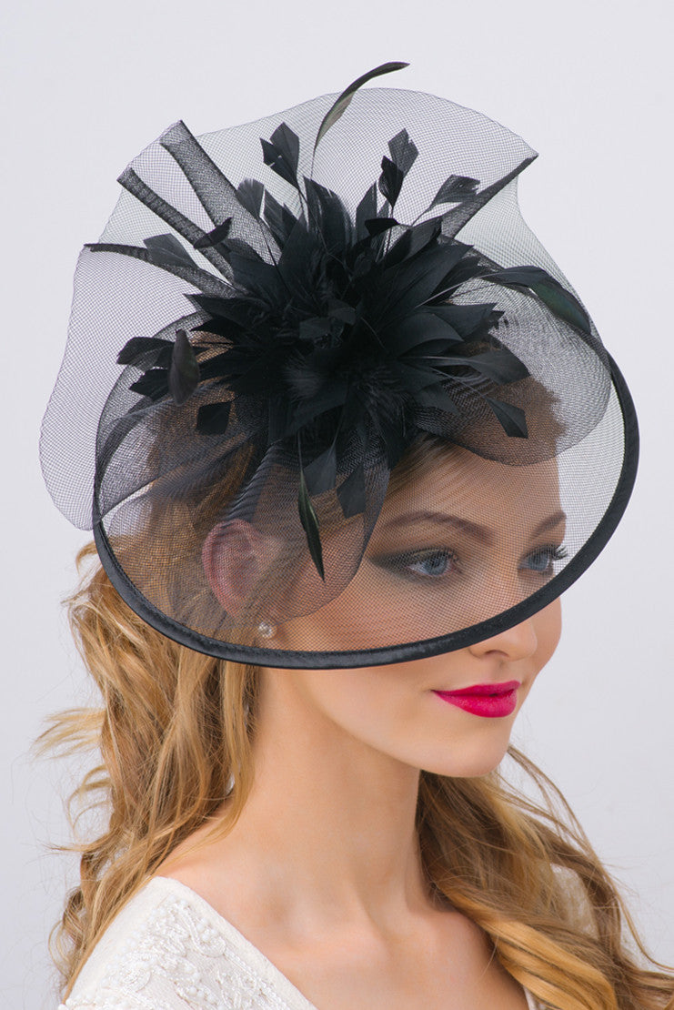 You are a picture of glamorous sophistication when you put on this romantic fascinator! Modern with a vintage touch, this elegant horse hair mesh base adorns a beautiful bouquet of soft feathers. A soft satin trim offers and allure that’s simply breathtaking.