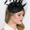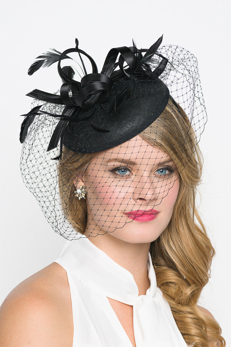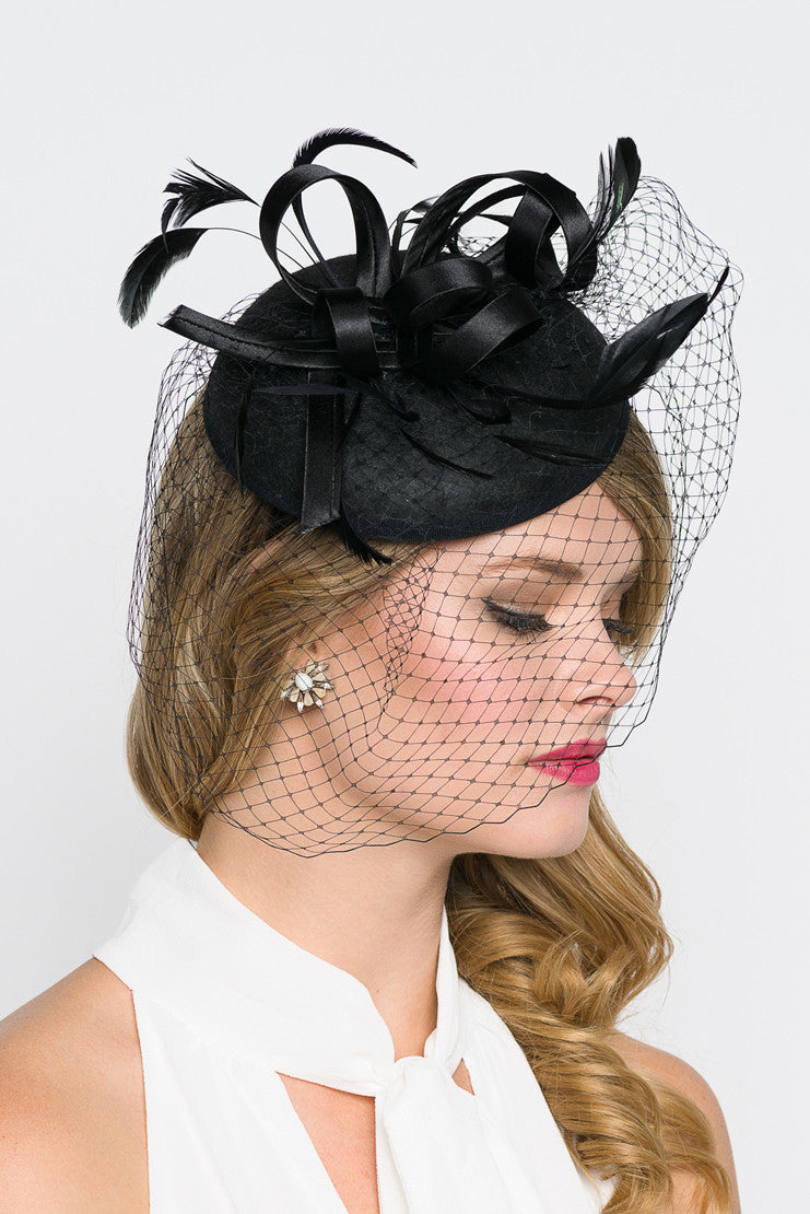 Be the envy of the party in this elegant felt fascinator. The round felt base is covered with satin ribbon loops, adorned with flighty feathers and topped off with a birdcage veil. This gorgeous piece is perfect for any special occasion.