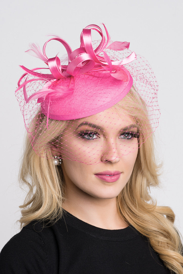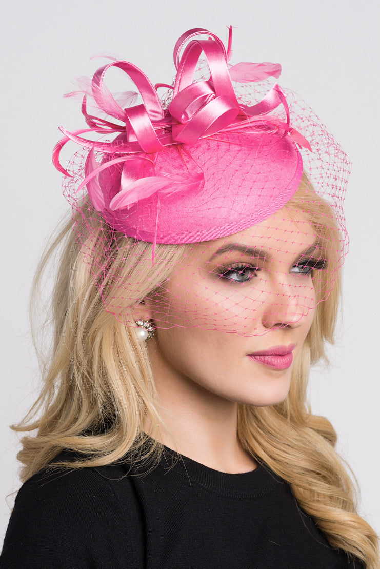 Be the envy of the party in this elegant felt fascinator. The round felt base is covered with satin ribbon loops, adorned with flighty feathers and topped off with a birdcage veil. This gorgeous piece is perfect for any special occasion.