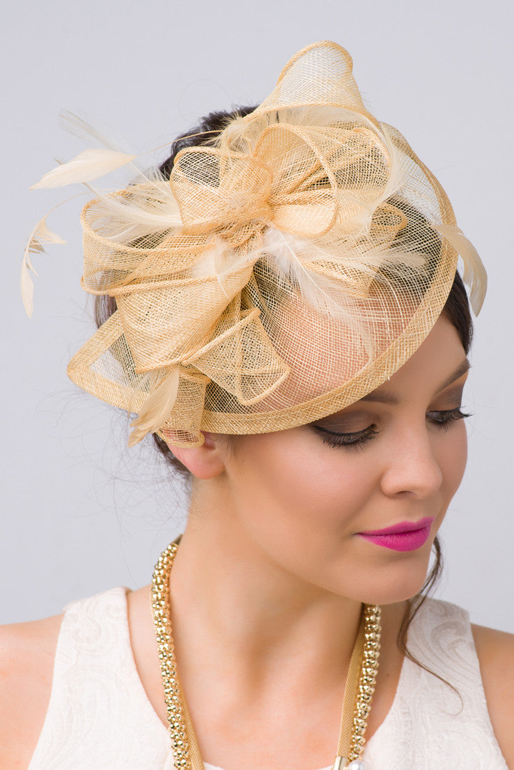 Timeless glamour. This sassy fascinator gives a nod to vintage style with a bouncy mesh ribbon and flighty feathers. With its classic sinamay mesh shape and elegant look it will be your go-to fascinator for the season.