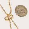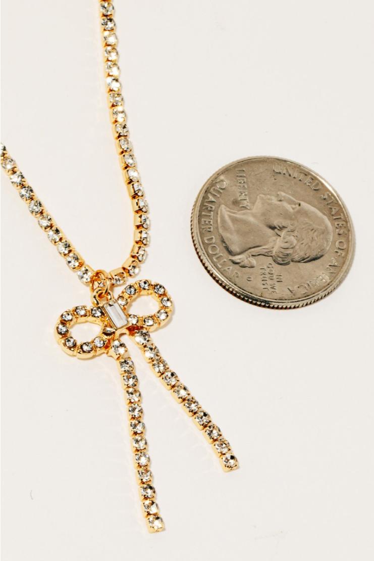 Shine bright like a diamond with our Rhinestone Gold Chain and Ribbon Bow Pendant Necklace! This playful piece features a sparkly rhinestone chain and a unique ribbon bow pendant, perfect for adding a touch of fun and glamour to any outfit. (No boring necklaces allowed!)